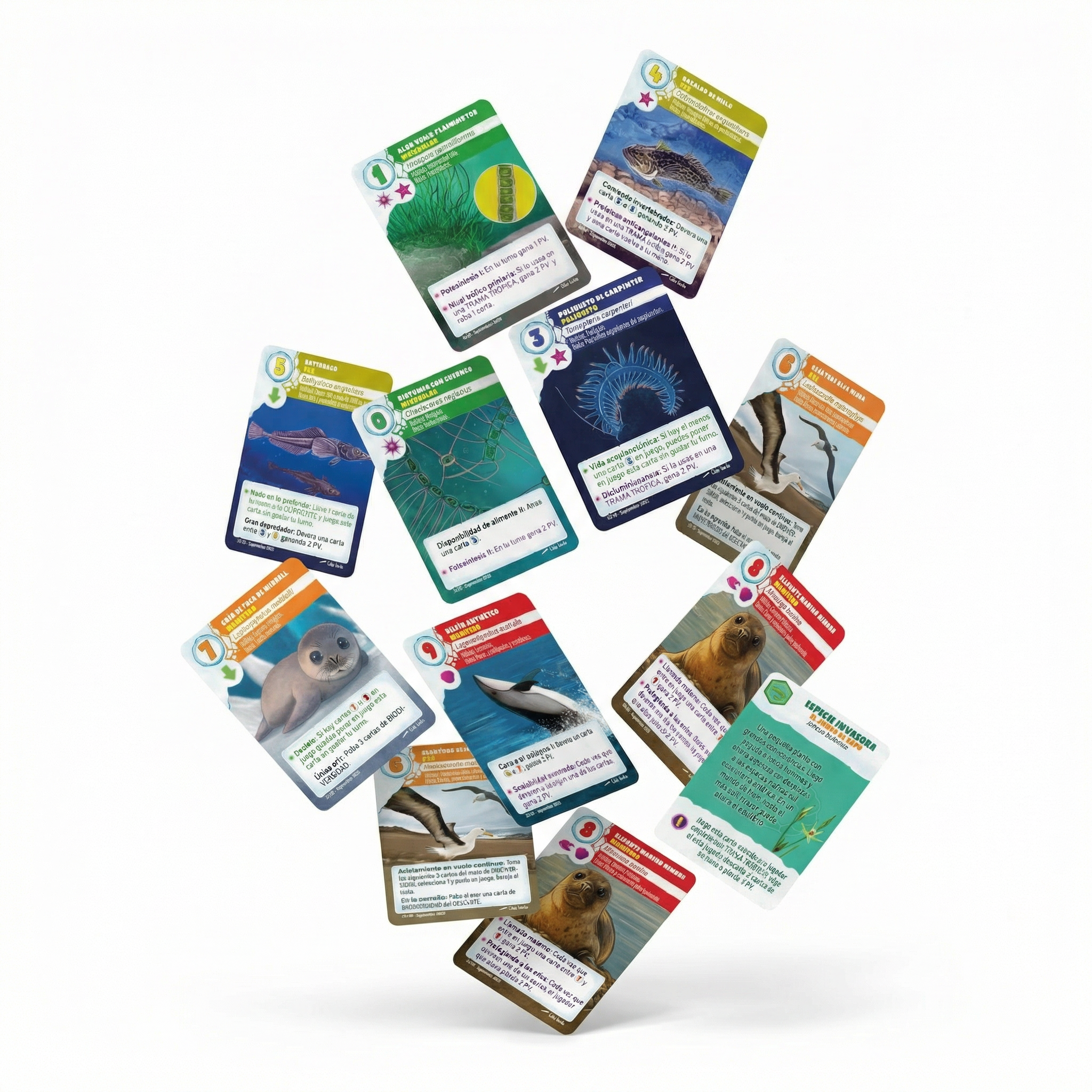 Se suman 32 cartas de biodiversidad que abren caminos nuevos sin necesidad de marearte con reglas extra. Algunas cartas, como la Manada de Orcas, no solo te hacen devorar una carta y ganar puntos, sino que le quitas puntaje a todos los demás jugadores. O la Cría de foca de Weddel, que parece inocente pero te hace robar 3 cartas de biodiversidad.